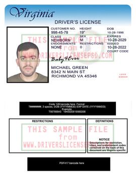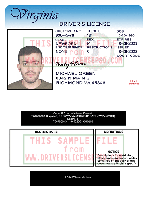 US Virginia Drivers License Details:This verification US Virginia Drivers License PSD can be used to verify the identity of an individual. With this Drivers License psd file, you can also modify all information on the Drivers License, include name, dob, expire date, Drivers License number, photo, signature,...This file using for confirm your identity on shop online, social network website, payment…