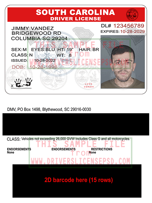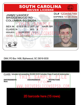US South Carolina Drivers License Details:This verification US South Carolina Drivers License PSD can be used to verify the identity of an individual. With this Drivers License psd file, you can also modify all information on the Drivers License, include name, dob, expire date, Drivers License number, photo, signature,...This file using for confirm your identity on shop online, social network…