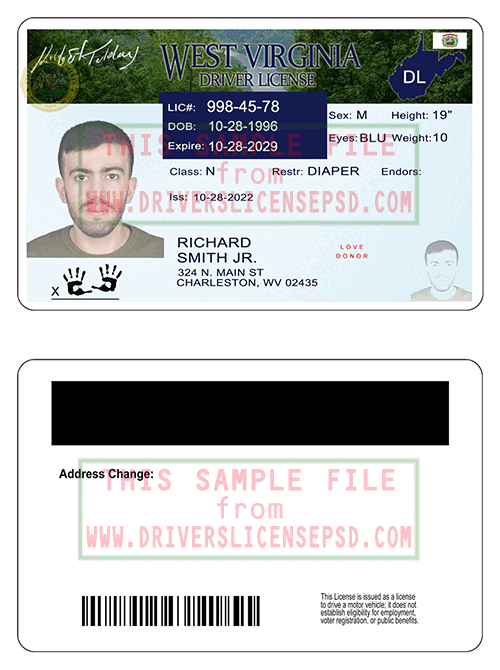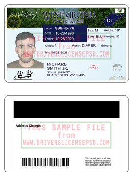 US West Virginia Drivers License Details:This verification US West Virginia Drivers License PSD can be used to verify the identity of an individual. With this Drivers License psd file, you can also modify all information on the Drivers License, include name, dob, expire date, Drivers License number, photo, signature,...This file using for confirm your identity on shop online, social network website,…