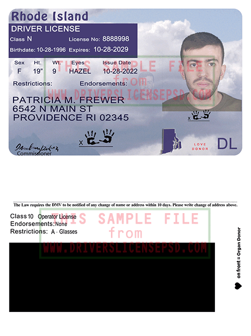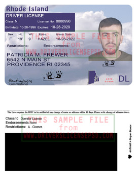 US Rhode Island Drivers License Details:This verification US Rhode Island Drivers License PSD can be used to verify the identity of an individual. With this Drivers License psd file, you can also modify all information on the Drivers License, include name, dob, expire date, Drivers License number, photo, signature,...This file using for confirm your identity on shop online, social network website,…