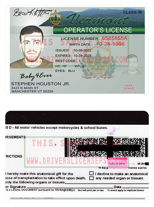 US Vermont Drivers License Details:This verification US Vermont Drivers License PSD can be used to verify the identity of an individual. With this Drivers License psd file, you can also modify all information on the Drivers License, include name, dob, expire date, Drivers License number, photo, signature,...This file using for confirm your identity on shop online, social network website, payment…