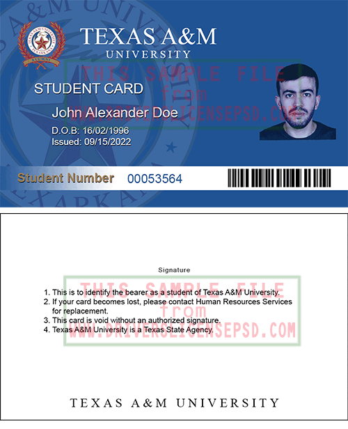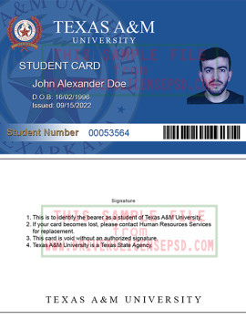 US Texas AM College Student ID Card Details:This verification US Texas AM College Student ID Card PSD can be used to verify the identity of an individual. With this Student ID Card psd file, you can also modify all information on the Student ID Card, include name, dob, expire date, Student ID Card number, photo, signature,...This file using for confirm your identity on shop online, social network…