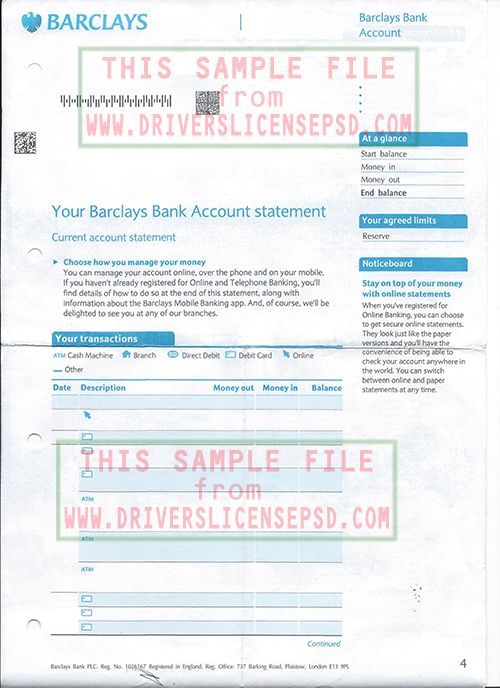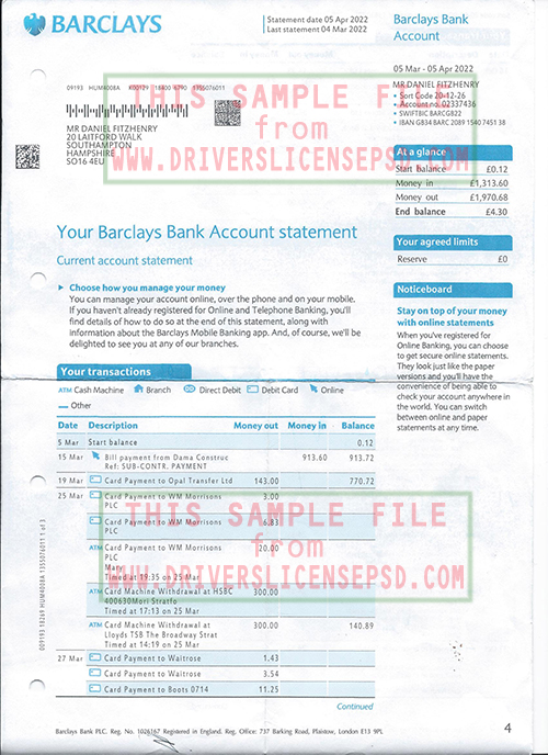 This verification UK Barclays Bank Statement PSD can be used to verify the identity of an individual.