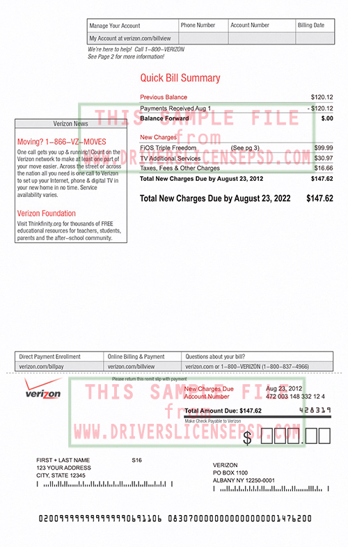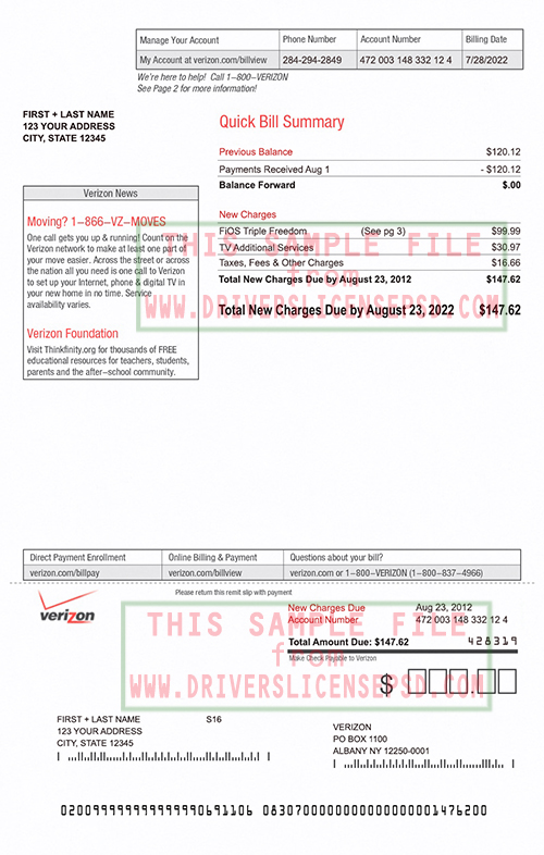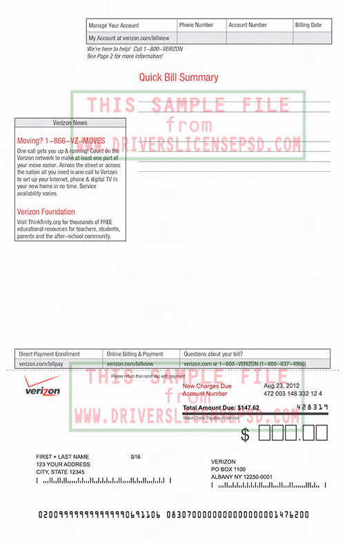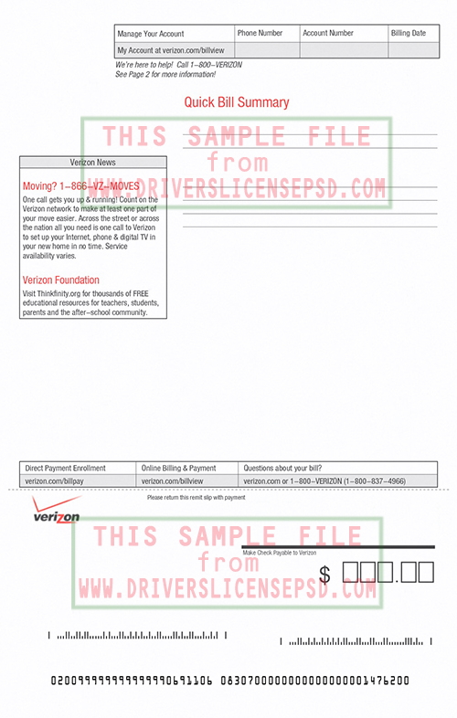 This verification US Verizon Utility Bill scan, can be used to verify the identity of an individual.
