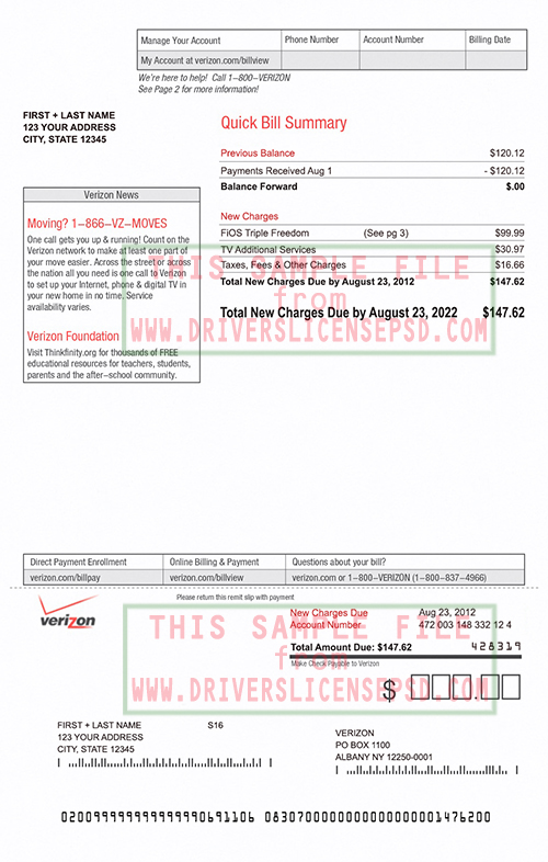 With this US Verizon Utility Bill PSD file, you can also modify all information on the template, include name, address, account number, date,...